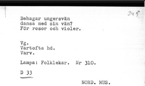 //// 1 < -' * .....J^f.'! //// Behagar ungersvän //// dansa med sin vän? //// För rosor och violer. //// t //// ' t //// * ; t //// Vg. //// Vartofta hd. //// Varv. //// < //// < //// Lampa: Folklekar. Nr 310. } //// t //// D 33 //// NORD. MUS. ////