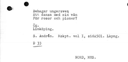//// — ^^ //// Behagar ungersveq //// Att dansa med sin vän //// För rosor och pioner? //// Ög. //// Linköping. //// S. Andrén. Mskpt. vol I, sidö501. Lkpng. //// D 33 //// NORD, MUS. ////