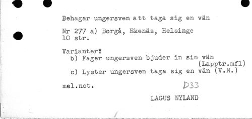 //// ) //// i //// * //// Behagar ungersven att taga sig en vän //// ^ Nr 277 a) Borgå, Ekenäs, Helsinge //// W 10 str. //// Varianter!? //// b) Fager ungersven bjuder in sin vän //// ! (Lapptr.mfl) //// ! c) Lyster ungersven taga sig en vän (V.N.) //// mel. not. //// LAGUS NYLAND //// * . - //// J,.. __ ^ _ ___/ . ////