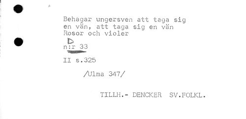 //// Behagar ungersven att taga sig //// en vän, att taga sig en vän //// i Rosor och violer //// ^^ n:r 33 //// II s.325 //// /Ulma 347 //// /TILLH.- DENCKER SV.FOLKL. ////