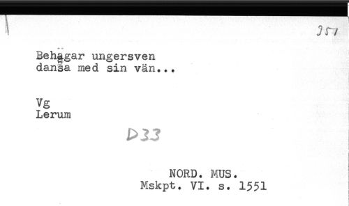 //// ! J r 7 //// — //// Behagar ungersven //// dansa med sin vän... //// Vg //// Lerum //// NORD. MUS. //// Mskpt. VI. s. 1551 ////