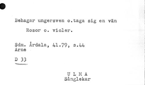 //// Behagar ungersven o.taga sig en vän //// < //// i //// Rosor o. violer. //// t //// Sdm. Årdala, 41.79, s.44 //// Arne ! //// D^33 //// U L M A //// Sånglekar //// t //// ! //// : ////
