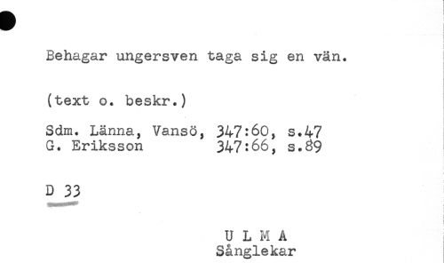 //// ) //// t //// t //// ! //// i //// Behagar ungersven taga sig en vän. //// ! //// < //// (text o. beskr.) //// Sdm. Länna, Vansö, 347:60, s.47 //// G. Eriksson 347:66, s.39 //// D 33 //// i //// ! //// U L M A I //// Sånglekar ////