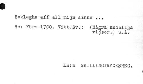 //// Beklaghe aff all mijn sinne ... //// Se: Före 1700. Vitt.Sv.: (Några andeliga //// vijsor.) u.å. //// KB:s SKILLINGTRYCKSREG. //// < ////