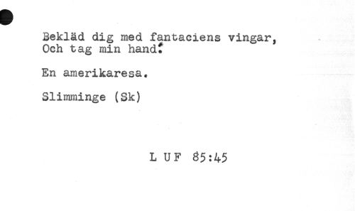 //// Bekläd dig med fantaciens vingar, //// Och tag min handt //// En amerikaresa. //// Slimminge (Sk) //// L UF 35:45 ////