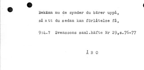 //// ^ Bekänn nu de synder du bärer uppå, //// ^ # * //// så att du sedan kan förlåtelse få, //// 9:4.? Svenssons saml.häfte Nr 29,s.76-77 //// ÅBO //// * ////