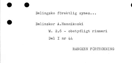 //// Belingsko föraktlig synes... //// * Belinskor A.Hannikoski //// W. 2.6 - obetydligt rinmieri //// Del I nr 44 //// RANCKEN FÖRTECKNING //// - ////