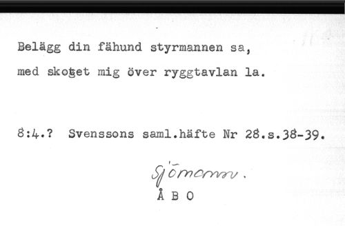 //// Belägg din fähund styrmannen sa, //// med skoget mig över ryggtavlan la. //// 8:4.? Svenssons saml.häfte Nr 28.s.38-39. //// f ////