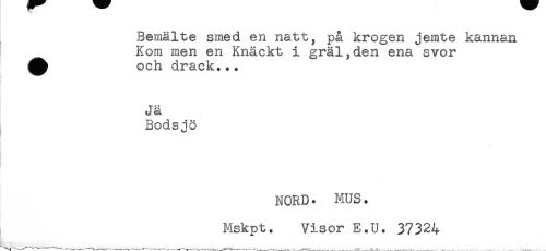 //// Bemälte smed en natt, på krogen jemte kannan //// Kom men en Knäckt i gräl,den ena svor //// ^ och drack... //// Jä //// Bodsjö //// NORD. MUS. //// Mskpt. Visor E.U. 37324 //// ^ . //// ----.---—---.--____. —___ . - ////