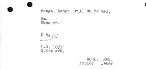 //// * Bengt, Bengt, vill du ha mej, //// Sm. //// Ukna sn. //// E.U. 10714 //// N.M:s ark. //// NORD. MUS. //// Kopior Lekar ////