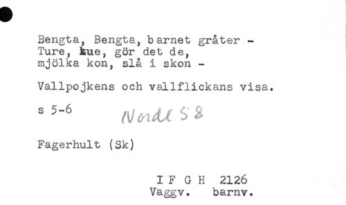 //// f //// Bengta, Bengta, barnet gråter - //// Ture, kue, gör det de, //// mjölka kon, slå i skon - //// Vallpojkens och vallflickans visa. //// Fagerhult (Sk) //// I F G H 2126 //// Vaggv. barnv. ////