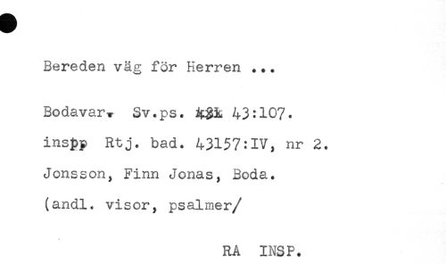 //// Bereden väg för Herren ... //// Bodavar-* Sv.ps. 43:107. //// inspp Rtj. bad. 43157:IV, nr 2. //// Jonsson, Finn Jonas, Boda. //// (andl. visor, psalmer //// /RA INSP. ////