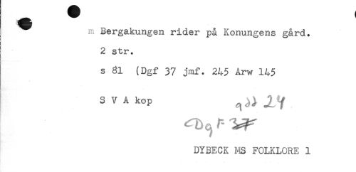 //// m Bergakungen rider på Konungens gård. //// 2 str. //// } //// i //// s 61 (Dgf 37 jrnf. 245 Arw 145 //// SVAkop //// DYBECK MS FOLKLORE 1 ////