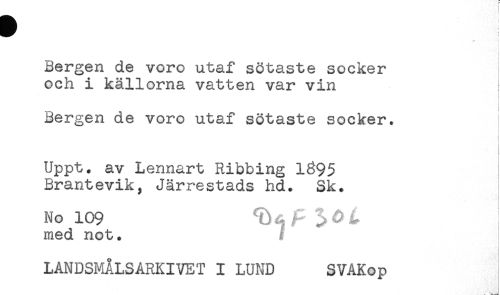 //// } //// ) //// - //// Bergen de voro utaf sötaste socker //// och i källorna vatten var vin //// Bergen de voro utaf sötaste socker. //// . t //// Uppt. av Lennart Ribbing 1^95 //// Brantevik, Järrestads hd. Sk. //// No 109 //// med not. //// LANDSMÅLSARKIVET I LUND SVAKop ////