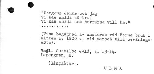 //// ^ "Bergens Janne och jag //// vi kan smida så bra, //// vi kan smida som herrarna vill ha." //// (Visa begagnad av smederna vid Ferna bruk i //// mitten av 1800-t. vid marsch till bevärin^s- //// möte). ^ //// Vsgl. Gunnilbo 4918, s. 13-14. //// Lagergren, E. //// (Gånglåtar). //// U L M A ////
