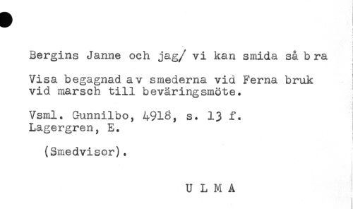 //// ! //// t //// i //// Bergins Janne och jag/ vi kan smida så b ra //// Visa begagnad av smederna vid Ferna bruk //// vid marsch till beväringsmöte. //// Vsml. Gunnilbo, 4918, s. 13 f. //// Lagergren, E. //// ! //// (Smedvisor). //// t //// U L M A ////