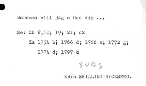 //// t //// Berömma vill jag o Gud dig ..* //// Se: Zb g,10; 19; 21; d2 //// -< i //// Zz 1734 b} 1766 d; 1766 a; 1772 g; //// 1774 d; 1797 d //// KB:s SKILLINGTRYCKSREG. ////