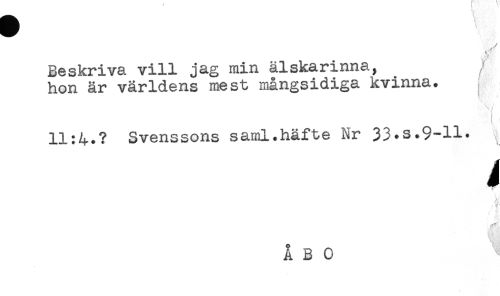 //// Beskriva vill jag min älskarinna, //// hon är världens mest mångsidiga kvinna. //// * //// i //// 11:4.? Svenssons saml.häfte Nr 33.S.9-H* ////