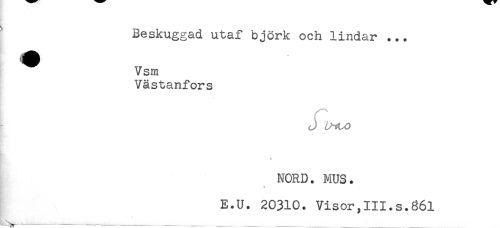 //// Beskuggad utaf björk och lindar ... //// q] ) //// Vsm //// Västanfors //// NORD. MUS. //// E.U. 20310. Visor,III.s.361 //// .... - - - — ___ — ___ ____ ////