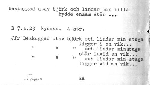 //// Resxuggaa u^av DjorK och lindar min lilla ! //// hydda ensam står .. 4 ! //// B 7.S.23 Hyddan. 4 str. J //// ' ' i å^É' ) //// Jfr Beskuggad utav björk och lindar min stuga : //// ligger i en vik... I //// " " ^ och lindar min sbuga ; //// står invid en vik... //// " ^ ^ och lindar min stuga //// ligger vid en vik... //// F t //// J RÅ ////