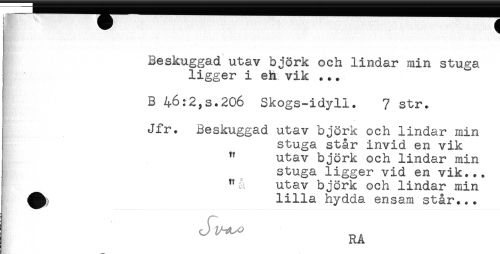 //// Beskuggad utav björk och lindar min stuga //// ligger i eh vik ... //// B 46:2,s.206 Skogs-idyll. 7 str. //// Jfr. Beskuggad utav björk och lindar min //// stuga står invid en vik //// " utav björk och lindar min //// stuga ligger vid en vik... //// ^ "a utav björk och lindar min //// lilla hydda ensam står... ////