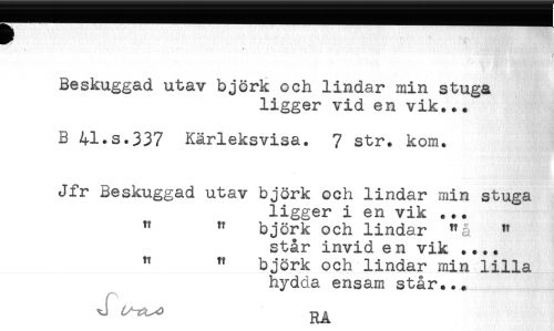 //// //// /Beskuggad utav björk och lindar min stuga //// ligger vid en vik... //// B 41.s.337 Kärleksvisa. 7 str. kom. //// Jfr Beskuggad utav björk och lindar min stuga //// ligger i en vik ... //// " " björk och lindar "å " //// står invid en vik .... //// " " björk och lindar min lilla //// hydda ensam står... //// ^ ^^ RA ////