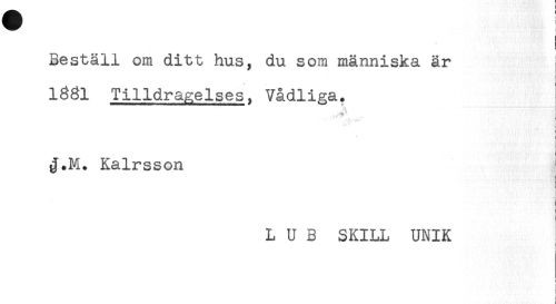 //// — } //// Beställ om ditt hus, du som människa är //// 1881 Tilldragelses, Vådliga. //// . //// . < # //// J.M. Kalrsson //// L U B SKILL UNIK //// : ////