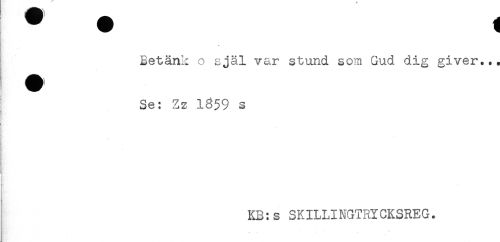 //// Betänk o själ var stund som Gud dig giver... //// Se: Zz 1359 s //// f . //// - //// { //// ! //// KB:s SKILLINGTRYCKSREG. ////