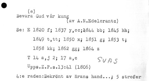 //// (e) //// Bevara Gud v år kung //// (av Å.N.Edelcrantz) //// Se: E 1820 f; 1837 y,cc;R844 bb; 1845 hh; //// 1849 t,tt; 1650 x; 1851 g; 1853 t; //// 1858 kk; 1862 gg; 1864 z //// T 14 a, j 2; 17 a,c J //// Upps.Z.P.s.13:41 (1806) //// 4:e raden:Bekrönt av ärans hand...; 5 strofer ////