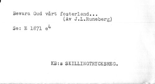 //// Bevara Gud vårt fosterland... //// (Av J.L.Runeberg) //// Se: E 1671 e^ //// KB:s SKILLINGTRYCKSREG. //// ' -il' ' //// ___,. —. ... - .. .. . J ////