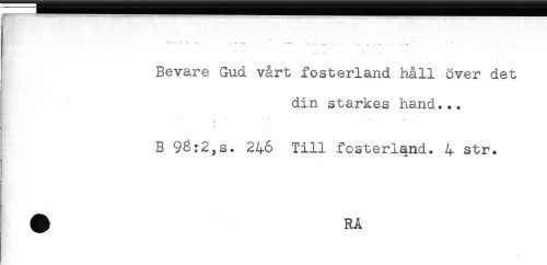 //// ** ^ - - - ......- - A - ---- . //// . ' - - - " ' ^ ' ..... - . ....... //// Bevare Gud vårt fosterland håll över det //// din starkes hand... //// f , - ^ //// c * ^ * //// B 246 Till fosterland. 4 str. ////