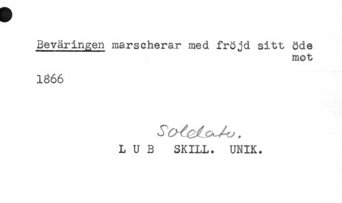 //// Beväringen marscherar med fröjd sitt öde //// mot //// 1866 //// L U B SKILL. UNIK. ////