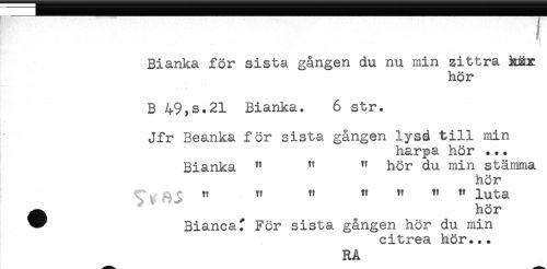//// ( //// Bianka för sista gången du nu min zittra hEY //// hör //// * t //// B 49,s.21 Bianka. 6 str. //// Jfr Beanka för sista gången lysd till min //// harpa hör ... //// Bianka " " " hör du min stämma //// hör //// ^ , ^ tt tt tt tt tt tt tt inta //// ^ ^ ' ^^ hör //// * Biancaf För sista gången hör du min //// citrea hör... //// RÅ ////
