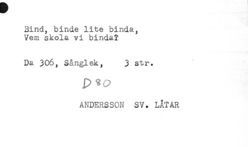 //// Bind, binde lite binda, //// Vem skola vi binda? //// Da 306, Sånglek, 3 str. //// p SO //// ANDERSSON SV. LÅTAR ////