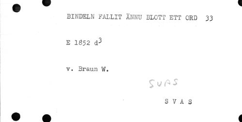 //// BINDELN FALLIT ÄNNU BLOTT ETT ORD 33 //// - - ... //// E 1852 d3 //// * //// v. Braun W. //// S V A S ////
