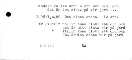 //// j3j-iiu.e_Lii amiu euu ora, ocn //// det är det sista på vår jord ... //// ^ B 98:1,3.69 Det sista ordet. 12 str. //// } //// Jfr Bindeln fallit ännu blott ett ord och //// det är mitt sista här på jord //// " fallit ännu blott ett ord och //// det är det sista här på jord //// y ^ RA ////