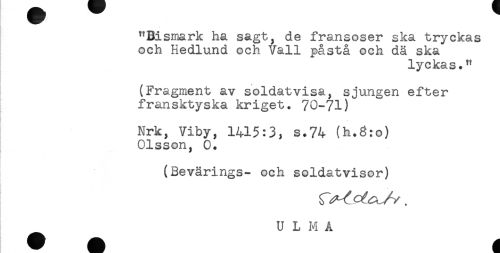 //// "Bismark ha sagt, de fransoser ska tryckas //// och Hedlund och Vall påstå och dä ska //// lyckas." //// (Fragment av soldatvisa, sjungen efter //// fransktyska kriget. 70-71) //// Nrk, Viby, 1415:3, s.74 (h.8:o) //// Olsson, 0. //// I (Bevärings- och soldatvisor) //// ^ U L M Å ////