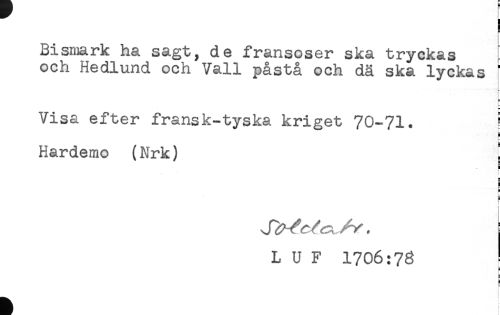 //// B //// Bisnnrk ha sagt, de fransoser ska tryckas //// och Hedlund och Vall påstå och dä ska lyckas //// * //// a //// Visa efter fransk-tyska kriget 70-71. ! //// F //// E //// Hardemo (Nrk) ] //// — //// E //// c //// e //// ) //// < //// L U F 1706:7^ ////