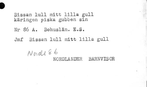 //// Bissan lull mitt lilla gull //// käringen piska gubben sin i //// Nr 86 A. Bohuslän. E.S. //// Jmf Bissan lull mitt lilla gull //// NORDLANDER BARNVISOR //// t //// i //// < ////