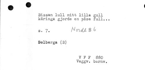 //// Bissan lull mitt lilla gull //// käringa gjorde en påse full... //// s. 7. % L //// Solberga (B) //// V F F 880 //// Vaggv. barnv. ////