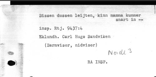 //// -- ** * ' w. //// * H //// ' ) //// Bissen dussen leijten, kinn mamma kummer //// snart in — //// insp. Rtj. 9437:4 //// Eklundh. Carl Hugo Sandviken //// __ * //// * //// (Barnvisor, nidvisor) //// RA INSP. //// -ar-' - //// __ ////