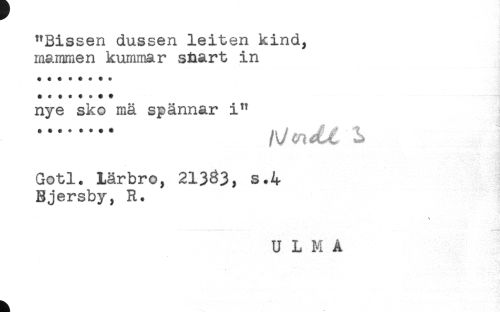 //// "Bissen dussen leiten kind, //// mammen kummar shart in //// nye sko mä spännar i^ //// ... //// Gotl. Lärbro, 213^3, s.4 //// Bjersby, R. ////