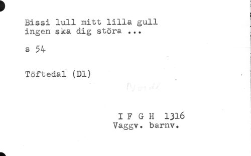 //// Bissi lull mitt lilla gull //// ingen ska dig störa ... //// s 54 //// * //// Töftedal (Dl) //// I F G H 1316 //// Vaggv. barnv. ////