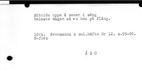 //// Bittida oppe å sener i säng //// helaste dagen så va han på fläng. //// 10:4. Svenssons s aml.häfte Nr 12. s.95-96. //// H-fors //// ÅBO ////
