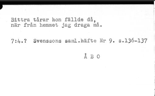 //// Bittra tårar hon fällde då, //// när från hemmet jag draga må. //// 7:4.? Svenssons saml.häfte Nr 9. s.136-137 //// t //// ÅBO //// i //// * //// f //// H //// i* //// i ////