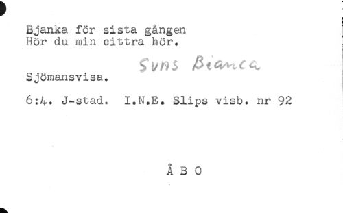 //// Bjanka för sista gången //// Hör du min cittra hör. ' //// t //// Sjömansvisa. //// 6:4. J-stad. I.N.E. Slips visb. nr 92 ////