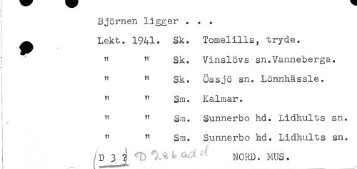 //// j ^ Lekt. 1941. Sk. Tomelills, tryde. //// 1 " " Sk. Vinslövs sn.Vanneberga. //// ! //// ] ^ ^ Sk. Össjö sn. Lönnhässle. //// ^ ^ Sm. Kalmar. //// ^ ^ Sm. Sunnerbo hd. Lidhults sn. //// ^ Sm. Sunnerbo hd. Lidhults sn. //// D 3 J t) ^ ^ ' ' NORD. MUS. ////