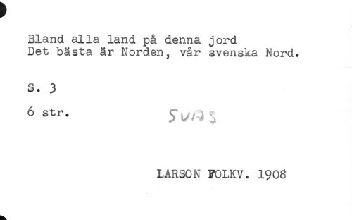 //// Bland alla land på denna jord //// Det bästa är Norden, vår svenska Nord. //// S. 3 //// 6str. ftA^ //// LARSON FOLKV. 1908 //// * ////