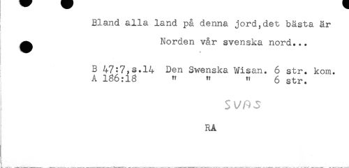 //// Bland alla land på denna jord,det bästa är //// ^ Norden vår svenska nord... //// B 47:7,s.l4 Den Swenska Wisan. 6 str. kom. //// A 186:1g " " " 6 str. //// J //// } S^/^J //// RA ////