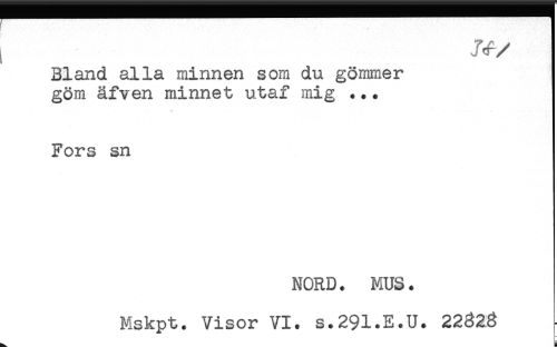 //// Bland alla minnen som du gömmer //// göm äfven minnet utaf mig ... //// ^ .. , . - . . . - ... - % ;! //// Fors sn //// NORD. MUS. //// Mskpt. Visor VI. S.291.E.U. 22828 ////